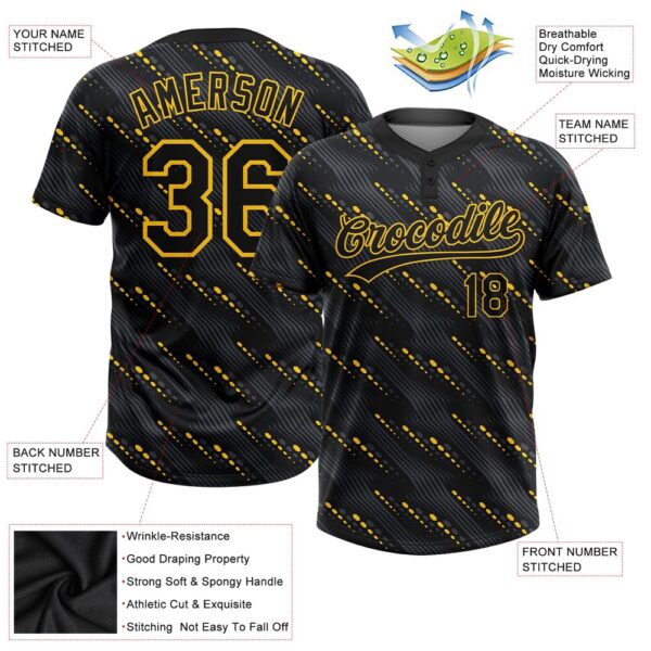 Black Black Gold 3D Pattern Two Button Unisex Softball Jersey, Custom Team Softball Jersey Stay game ready with our stylish softball jerseys Designed with lightweight, breathable fabric, they provide ultimate comfort and mobility for every play. Featuring vibrant colors and durable stitching, these jerseys combine performance and style, perfect for athletes and fans alike