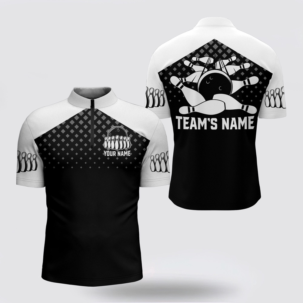 Bowling Jersey, Black White Bowling Bowling Jersey Shirt For Men Custom Bowling Jersey 14 Zip Bowling Shirt For Team The Bowling Jersey is the pinnacle of personalized style on the lanes. Crafted for both performance and flair, it combines comfort with a distinctive look. Made from premium fabrics, it offers ease of movement and breathability during every roll. The unique design, often featuring bold patterns and customizable options, adds a touch of individuality to your game. Whether you’re a casual bowler or a seasoned pro, the Bowling Jersey is a statement piece that showcases your love for the sport. Stand out on the lanes and embrace both comfort and personality with this essential bowling apparel.