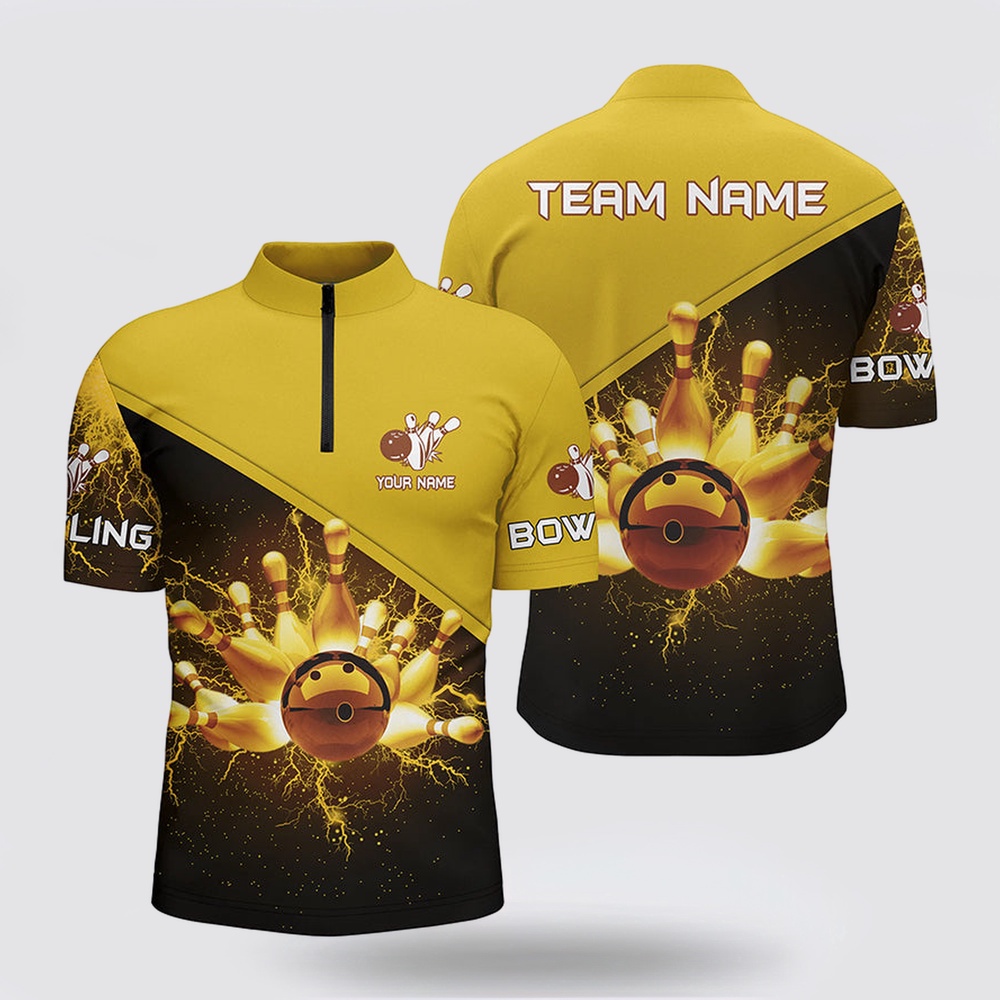 Bowling Jersey, Men Bowling Jersey Shirts Custom Gold Lightning Thunder Bowling Team Jersey, Gift For Team Bowlers The Bowling Jersey is the pinnacle of personalized style on the lanes. Crafted for both performance and flair, it combines comfort with a distinctive look. Made from premium fabrics, it offers ease of movement and breathability during every roll. The unique design, often featuring bold patterns and customizable options, adds a touch of individuality to your game. Whether you’re a casual bowler or a seasoned pro, the Bowling Jersey is a statement piece that showcases your love for the sport. Stand out on the lanes and embrace both comfort and personality with this essential bowling apparel.
