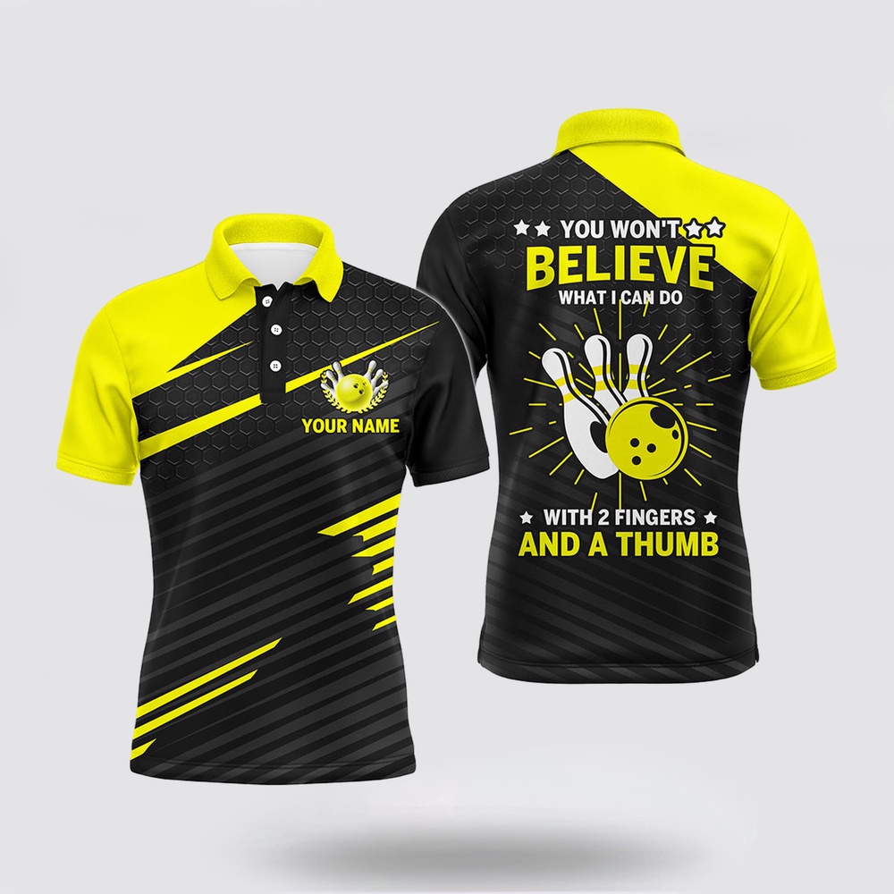 Bowling Polo Shirt, Funny Bowling Polo Shirt Yellow & Black Custom Bowling Jersey, 2 Fingers And A Thumb Polo shirts are the embodiment of casual sophistication. They are crafted with a blend of comfort and style, offering a versatile wardrobe essential. The classic collar and button-up design effortlessly bridge the gap between relaxed and polished. Made from premium fabrics, they provide a comfortable fit while maintaining a refined look. Whether for a smart-casual office day or a weekend outing, polo shirts deliver an effortless ensemble that exudes confidence and timeless charm, making them a must-have for any fashion-forward individual.