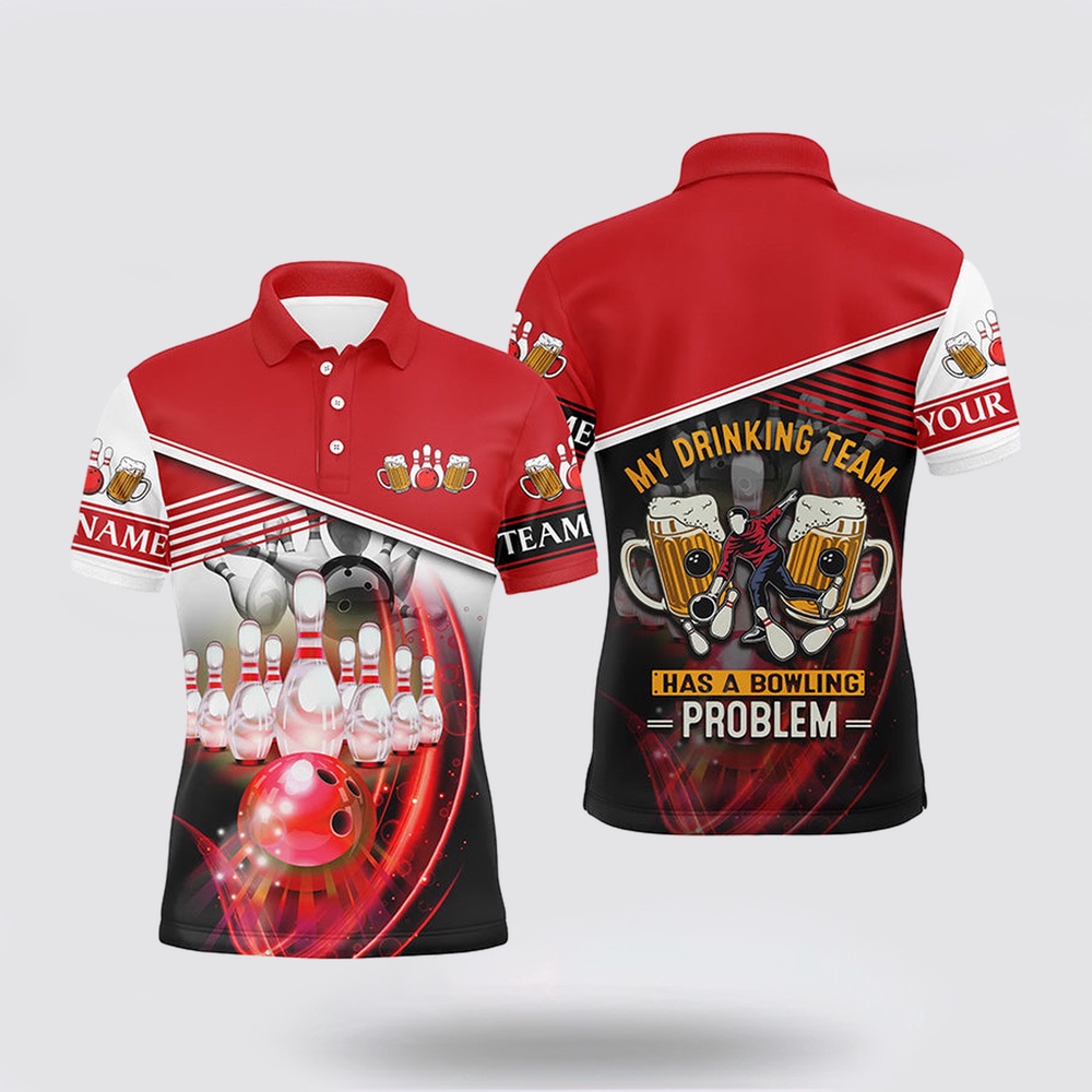 Bowling Polo Shirt, Funny Bowling Polo Shirts Custom Team Name My Drinking Team Has A Bowling Problem Red Polo shirts are the embodiment of casual sophistication. They are crafted with a blend of comfort and style, offering a versatile wardrobe essential. The classic collar and button-up design effortlessly bridge the gap between relaxed and polished. Made from premium fabrics, they provide a comfortable fit while maintaining a refined look. Whether for a smart-casual office day or a weekend outing, polo shirts deliver an effortless ensemble that exudes confidence and timeless charm, making them a must-have for any fashion-forward individual.