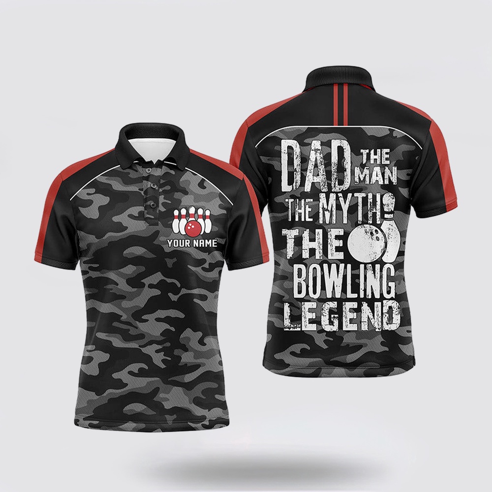 Bowling Polo Shirt, Mens Polo Bowling Shirts Custom Black Camo Bowling Team Jersey Dad The Man The Myth Bowling Legend Polo shirts are the embodiment of casual sophistication. They are crafted with a blend of comfort and style, offering a versatile wardrobe essential. The classic collar and button-up design effortlessly bridge the gap between relaxed and polished. Made from premium fabrics, they provide a comfortable fit while maintaining a refined look. Whether for a smart-casual office day or a weekend outing, polo shirts deliver an effortless ensemble that exudes confidence and timeless charm, making them a must-have for any fashion-forward individual.