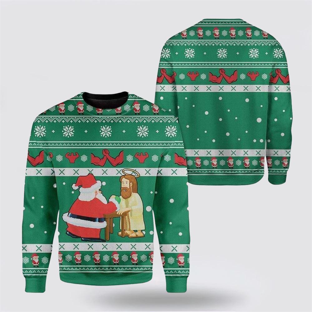 Funny Jesus & Santa Ugly Christmas Sweater For Men & Women – Gifts For Christians – Excoolent The Sweater is the epitome of classic comfort and style. Crafted from premium materials, it offers warmth and softness, making it a must-have for chilly days. With its versatile design, it effortlessly complements various outfits, whether layered over a shirt or paired with jeans. The timeless appeal of a sweater transcends trends, ensuring it remains a wardrobe staple season after season. Elevate your coziness and fashion game with this essential piece that exudes both elegance and comfort.