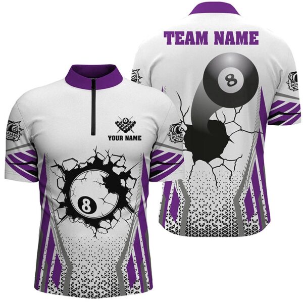 White Purple 8 Ball Pool Cracked Wall Jersey Shirts, Custom Billiard Attire Jerseys, Personalized Billiard Team Jersey Shirt – Excoolent Sports jerseys are the epitome of personalized style in athletics. They are crafted to deliver both performance and flair, seamlessly blending comfort with a distinct appearance. Constructed from premium fabrics, they offer unrestricted movement and breathability during every game. With their unique designs, often showcasing bold patterns and customizable options, sports jerseys add a touch of individuality to your sporting attire. Whether you’re a casual player or a seasoned pro, a sports jersey is a statement piece that reflects your love for the sport. Stand out on the field or court and embrace both comfort and personal style with this essential athletic apparel.